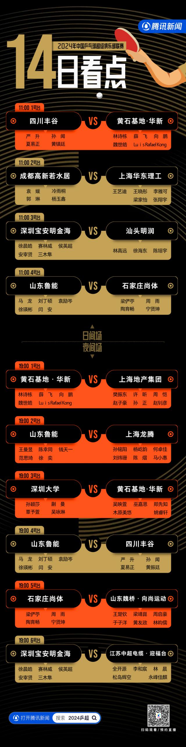 男团方面,晚上有四场比赛:上海地产 VS 黄石基地 · 山东魏桥华新 · 向尚运动 VS 尚体的石家庄,山东鲁能 VS 江苏中超电缆四川丰谷 · 迎福台 VS 深圳宝安明金海。第一场比赛非常有趣。上海地产有两个奥运冠军樊振东、许昕和黄石基地。 · 华新拥有世界冠军林诗栋,双方可能会爆发强强对决,值得大家关注。