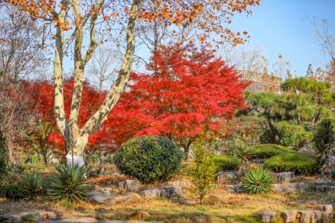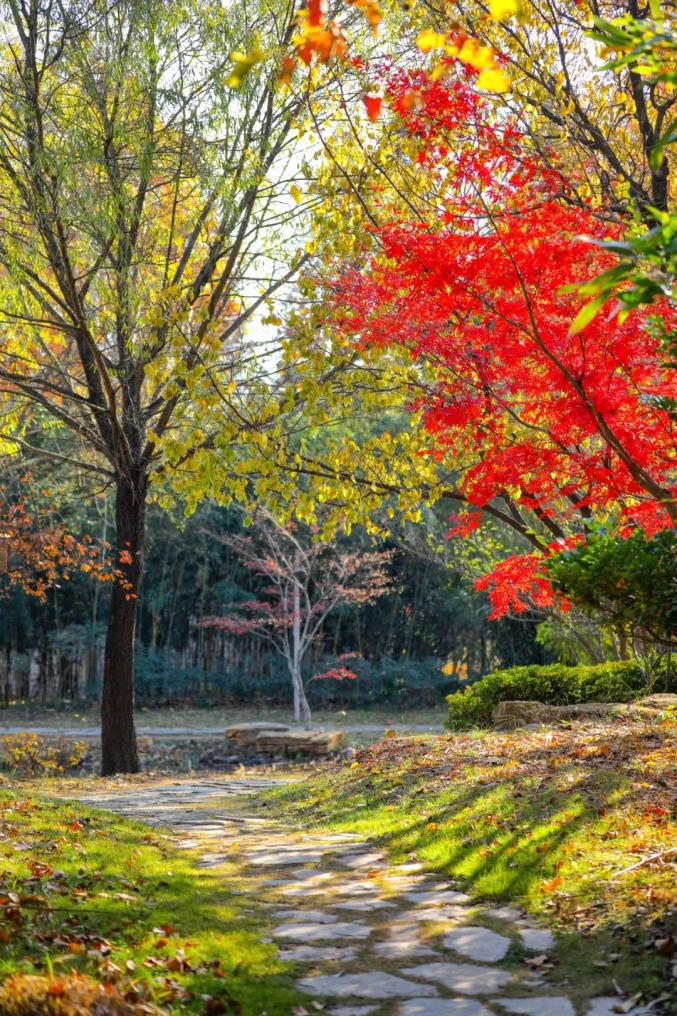 青黄枝叶与红灰砖瓦交相辉映。
