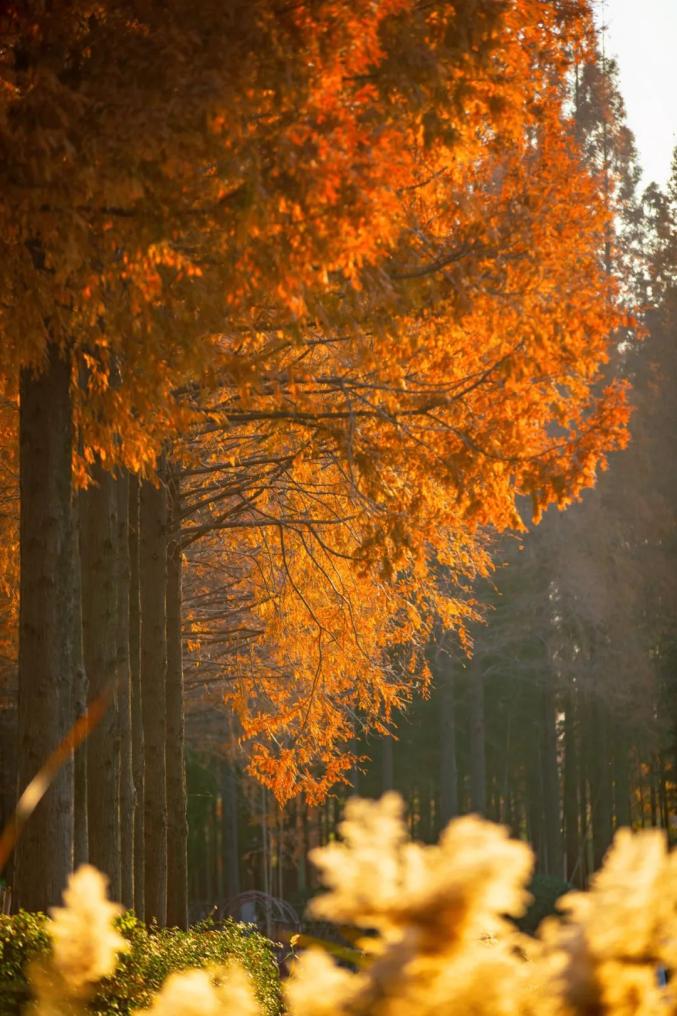 纵观望去,树梢上布满了夕阳。