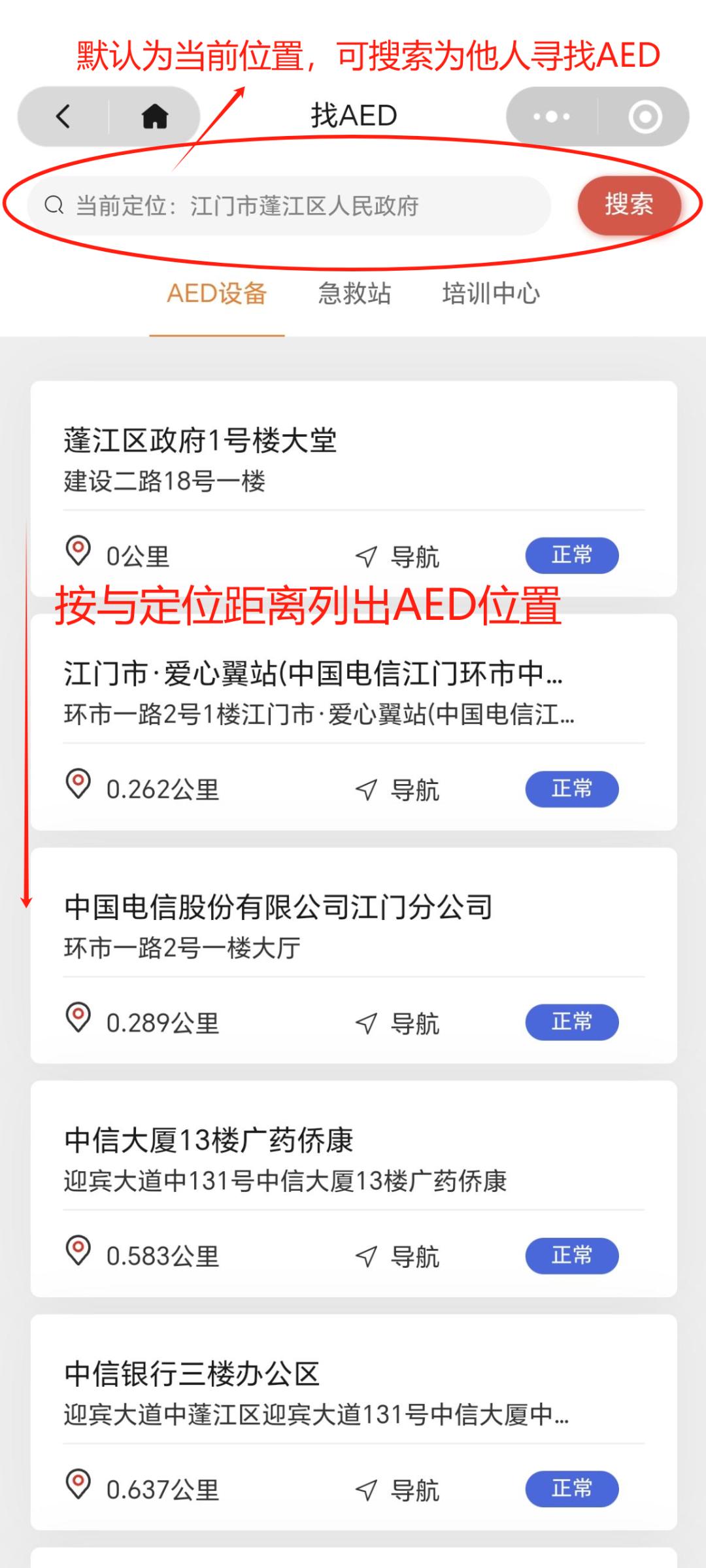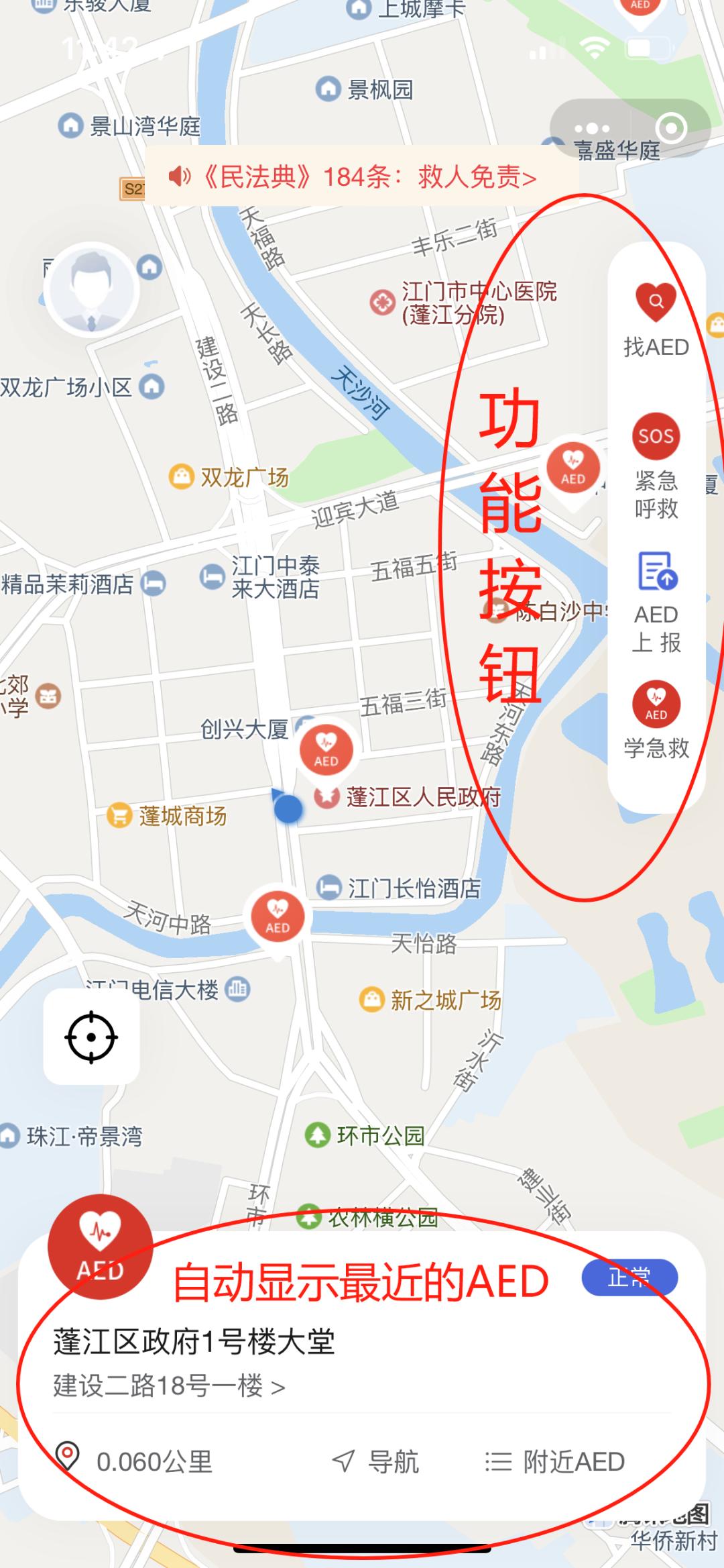 最近,“蓬江发布”微信官方账号为了带领市民寻找AED,增加了一项便民服务——“AED“救命地图,点击查看后,您将直接链接“AED城市地图”小程序。系统会根据需要开放用户定位信息,自动显示附近的AED,并根据距离从近到远进行排序。点击导航后,您可以前往获取AED。如遇问题,可联系周边地区的工作人员进行处理。蓬江区正常运行的106个AED位置清晰可见。市民通常可以熟悉他们周围的日常AED位置,在紧急情况下,他们可以在“黄金四分钟”内快速找到AED。
