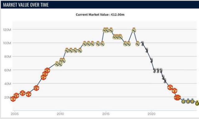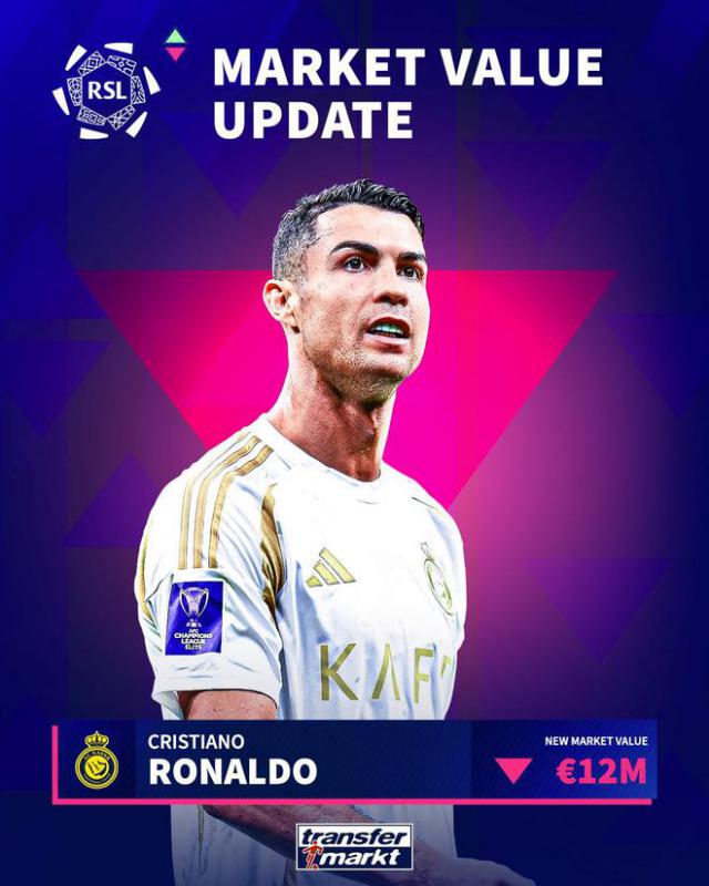 12 月 13 日本,德国转会市场网站更新了沙特球员的身价,39 岁 C 罗身家降到 1200 万欧。