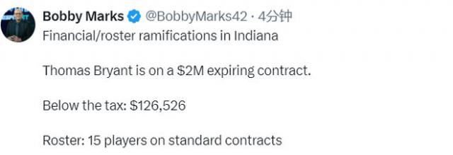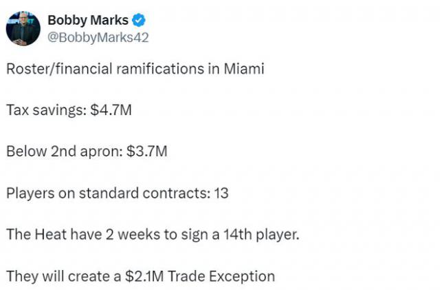 薪酬专家 Marks 表示,托布是 200 万到期合同,步行者换了他之后,15 在常规合同下,名球员离奢侈税线还有很远的路线。 126526 美金。对热火来说,在这笔交易完成后,可以节约。 470 一万美元的奢侈税,球队的总薪水在第二土豪线下 370 万,但是在常规合同下只剩下球员了。 13 根据规定,热火必须在两个星期内签下第一名。 14 名球员。他们还通过这笔交易创造了这笔交易 210 万的交易特例。