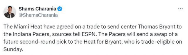 北京时间 12 月 14 日,据名记 Shams 消息人士透露,热火已同意将托马斯 - 将布莱恩特交易给步行者,以换取步行者未来的次轮签交换权,托马斯 - 布莱恩特将在那里 12 月 16 每天取得交易资格,届时预计交易会正式公布。