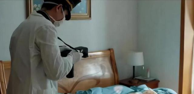 那时,一名警察正在卧室里拍照,我们可以看到床上的四件套是蓝色和白色的。