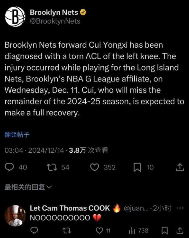心痛!崔永熙左膝十字韧带撕裂赛季报销,篮网主教练:全力帮助他康复!
