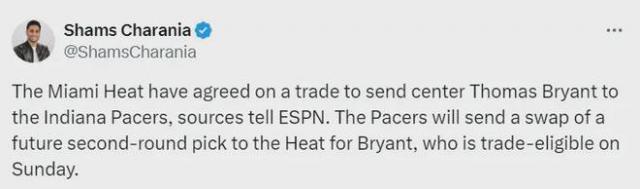 托马斯是热火 - 将布莱恩特交易给步行者,换取未来的次轮签交换权。