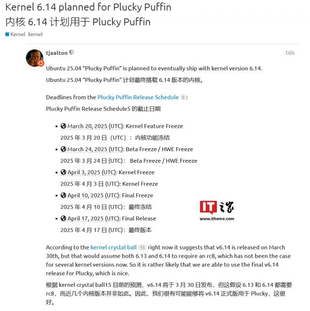 IT 世家 12 月 14 日消息,Canonical 工程师 Timo Aaltonen 昨日(12 月 13 日)在 Ubuntu 论坛发帖,确定 Ubuntu 25.04 将使用发行版 Linux 6.14 核心。