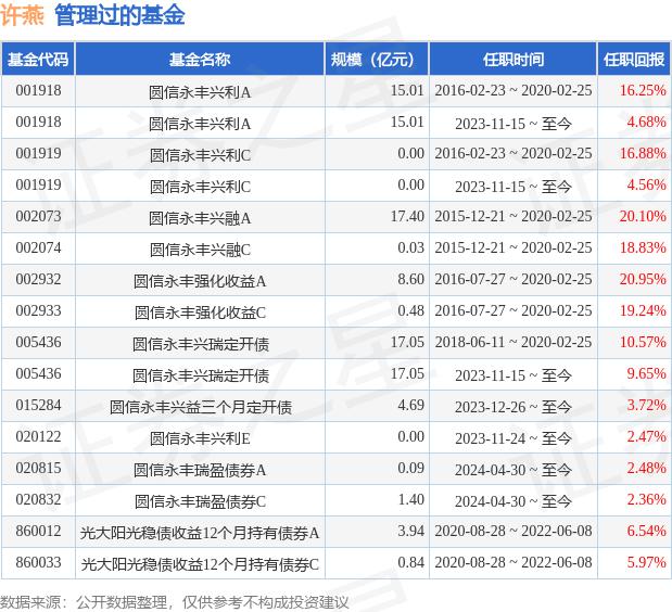 许燕女性:中国国藉,上海财经大学金融硕士,现任圆信永丰基金管理有限公司固定收益基金经理。曾任上海新世纪信用评估投资服务有限公司信用分析师、鹏元信用评估有限公司信用分析师。圆信永丰基金管理有限公司固定收益投资部基金经理、总监助理 ; 上海光大证券资产管理有限公司固定收益公募投资部基金经理 ; 圆信永丰基金管理有限公司风险管理部门信贷风险岗位。2016 年 1 月 22 日至 2019 年 1 月 24 2016年管理圆信永丰纯债券型证券投资基金 年 2 月 23 日至 2020 年 2 月 25 日本担任圆信永丰兴利债券型证券投资基金基金主管。2018 年 6 月 11 日至 2020 年 2 月 25 日任圆信永丰兴瑞 6 债券型发起式证券基金基金经理每月定期开放。2015 年 12 月 21 日至 2020 年 2 月 25 日本担任圆信永丰兴融债券型证券投资基金经理。2016 年 07 月 27 日至 2020 年 2 月 25 日本担任圆信永丰加强收益债券型证券投资基金经理。2020 年 8 月 28 日至 2022 年 06 月 08 日任光大阳光稳债收益 12 个月持有期债券型集合资产管理计划投资经理。2023 年 11 月 15 日本担任圆信永丰兴瑞 6 债券型发起式证券基金基金经理、圆信永丰兴利债券型证券投资基金基金经理每月定期开放。2023 年 12 月 26 日本担任圆信永丰三个月定期开放债券型证券投资基金经理。