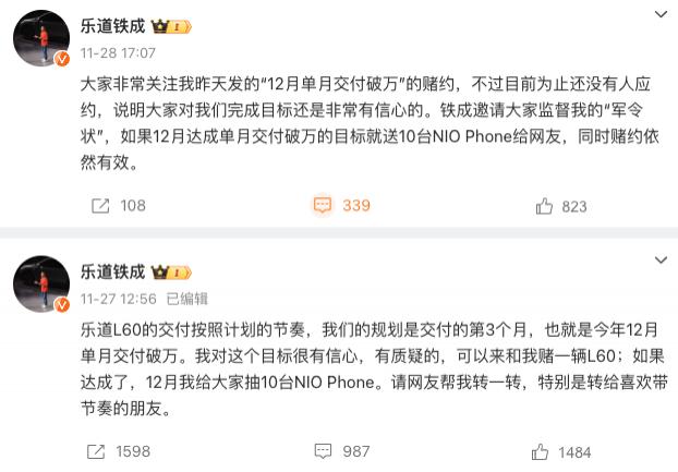最近,乐道 CEO 艾铁成一直在向大众传递乐道。 12 月能交 1 万的信心,甚至在自己的微博上和网友一起玩得很开心。 L60 制作筹码打赌。