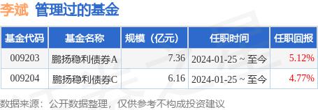 2024年证券之星消息 年 12 月 14 当天,鹏扬淳泰一年定开债券(018056)发布公告,增聘李斌为基金主管,就职日期自 2024 年 12 月 14 日起,焦翠不再担任基金基金主管,离职日期为 2024 年 12 月 14 日,鹏扬淳泰一年定开债券发起式(018056)基金主管为李斌。截至 2024 年 12 月 13 日,鹏扬淳泰一年定开债券发起净值为 与前一天相比,1.0602上升。 近一年来,0.14%上涨。 6.02%。