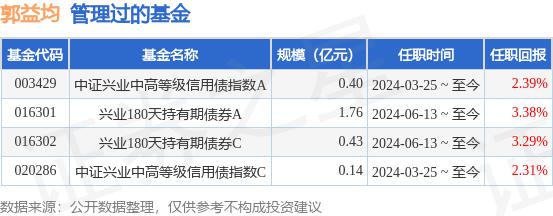 郭益均先生:2017年,中国国贷、上海交通大学工商管理硕士学位。 年 7 月入兴业基金固定收益研究部担任研究员,现任兴业加利债券投资基金、兴业福信债券投资基金、中证兴业中高级信用债券指数证券基金、兴业福信债券投资基金 3 基金经理助理,每月定期开放债券型发起式证券基金,兴业一年持有期债券型证券投资基金。2024 年 3 月 25 日任中证兴业中高等级信用债券指数证券基金经理变更。2024 年 6 月 13 日起任兴业 180 天空持有期债券型证券投资基金的基金经理。