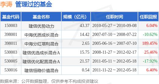 李涛先生:学士学位。曾在中国经济开发信托投资公司、西南证券、国泰君安证券公司、新时代证券、中海基金管理公司等单位工作。他曾担任投资银行部主管、行业研究员和基金经理。李涛于 2005 年 6 月 16 日至 2007 年 7 月 9 在此期间担任中海分红增利混合型证券投资基金主管基金 ; 于 2007 年 7 月 10 日至 2008 年 7 月 22 当天担任中海优质成长证券投资基金主管。李涛于 2008 年 9 每月加入建信基金管理公司。