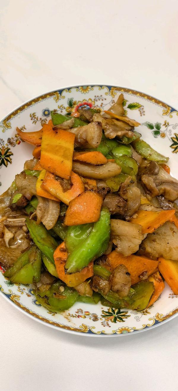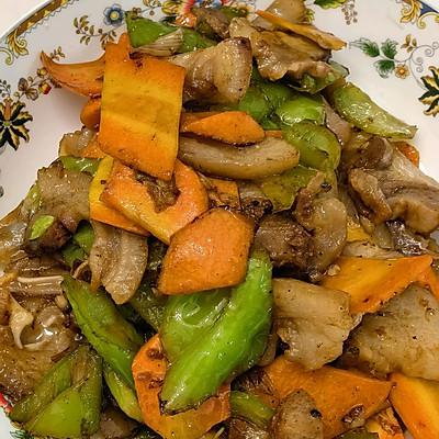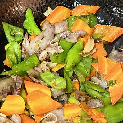 5、加入胡萝卜,翻炒至胡萝卜断生后加入青椒。只有同样的调料,就是酱油。加入酱油,翻炒后摆盘。