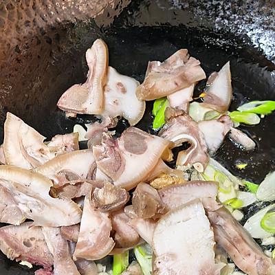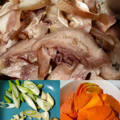 1、红烧猪头肉切片,胡萝卜,青椒切片,葱蒜切成图片备用。
