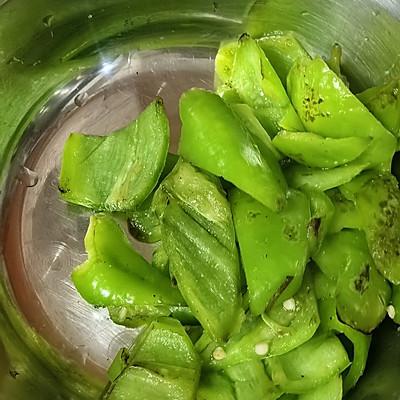 2、锅内不放油,下青椒炒至虎皮状,加一克盐。