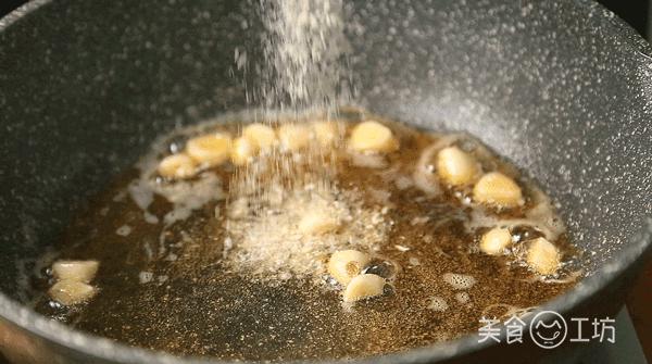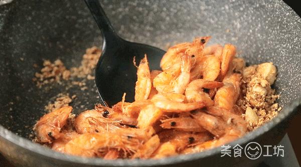 7. 在锅里留一点油,下蒜粒炒黄炒香,倒入面包糠炒至金黄。
