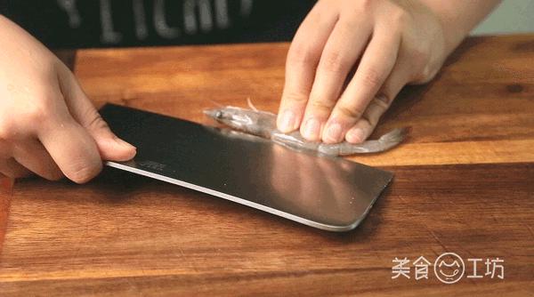 1. 用牙签挑出虾线,然后用刀将虾背打开。