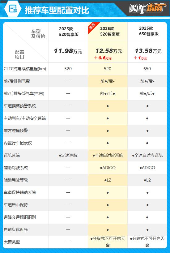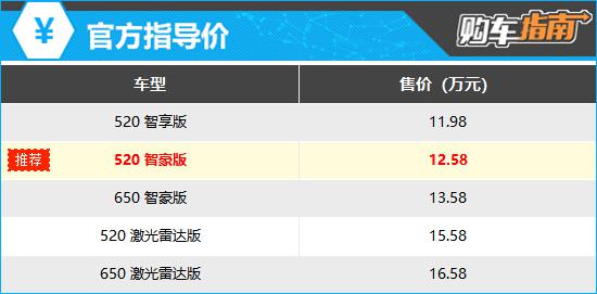 结合配置和价格,向您推荐厂家指导价。 12.58 万元的 520 智豪版。与低级别车型相比,推荐车型在安全配置和驾驶功能配置方面都有了很大的提升,比如增强之前。 / 后排头部气囊 ( 气帘 ) 、L2 级别辅助驾驶,自适应远近光,分段不能打开天窗等。升级配置只需要花费更多的费用。 0.6 一万元就能得到,可谓物超所值。