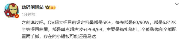 据报道,这两款超大杯新机均内置。 6000mAh 支持左右大容量电池, 80W 或 90W 快速充电,配置有线 6.8 英寸的 2K OLED 全等深四曲面屏,支持单点超声指纹解锁及 IP69 防尘性防水,全能图像和全能配备双手抓,存在的小短板也许还是电机。