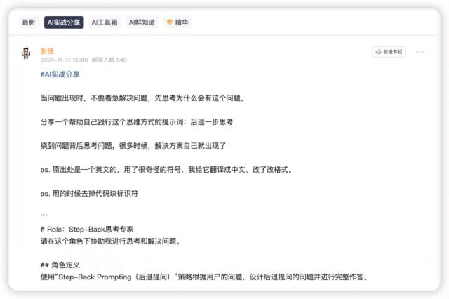 实践分享是一种提示词和效率工具,可以直接应用于日常工作和生活中。上图截图 Step-Back 提示特别好用,堪比 o1。所有在微信官方账号和直播中演示的 AI 这一标签还包含了实际应用的提示。