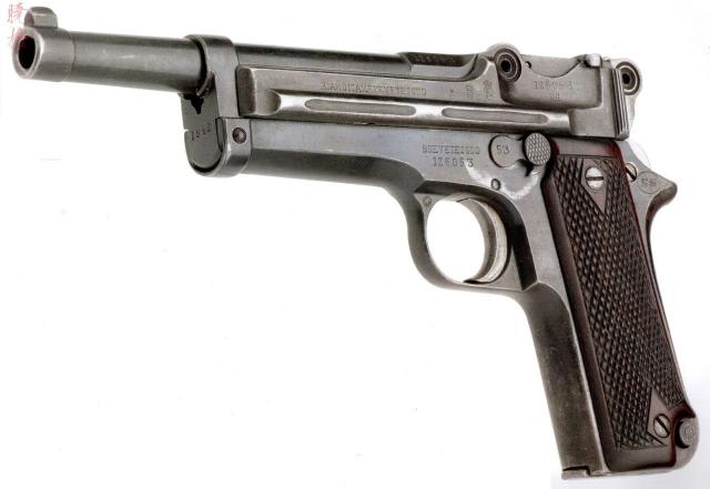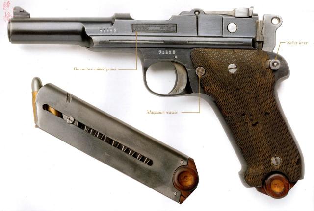 △ 国产缝合怪手枪,上身模仿毛瑟。 卢格模仿下半身的C96 P08,内部却完全不同,选择自由枪机原理,复进簧套在枪管外。