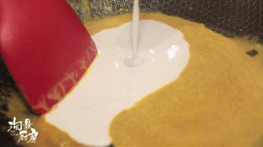 ❷ 锅中加入 2 调汤(30g)油咖喱和 1 调汤(15g)咖喱粉,炒匀。然后加入 4 三花淡奶和调羹(60ml) 6 椰奶调汤(90ml),搅拌均匀。