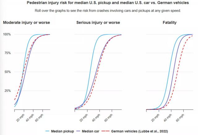 2004 2008年的相关研究已经说明,SUV 而且皮卡在交通事故中造成行人死亡的可能性是普通轿车。 2-3 倍数。这项研究进一步证实了这一点,并指出速度和车辆高度的叠加效应对行人安全的危害尤为明显。