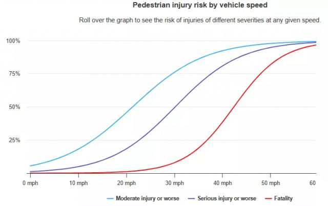 降低住宅区限速至 15 公里(约 24.14 公里) / 小时:研究表明,在这个速度下,行人受到严重伤害的可能性只有 10%的死亡风险几乎为零;