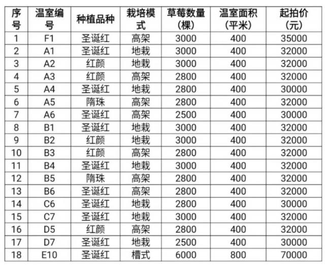昌农公司草莓收益权拍品北京金六环农业园 18 栋草莓温室 2024 年 12 月 21 日至 2025 年 5 每月草莓收益权,即高品质水果的全部权益 增值服务,每棚起拍价3 万元 /3.2 万元 /3.5 万元 /7 万元不等。