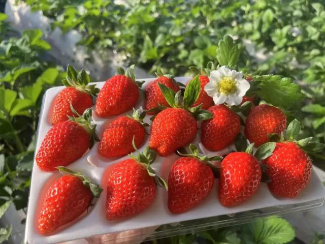 高架草莓以 H 种植架为主,棚内干净整洁,采收方便;路面栽培以南北为主,草莓产量高。日光温室为砖墙结构,平均面积约 400 平方米(50m*8m),棚内温度和湿度监测,蜜蜂授粉,种植。美女,隋珠,圣诞红三个草莓品种。金六环农业园草莓种植以质量为核心,加强标准化管理,注重生态环保,分级包装,生产出端正、入口甘甜的草莓果。