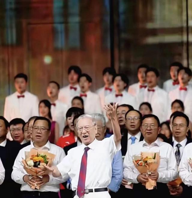 90年的中大百年校庆 老中文系教授黄天邈上台,精力充沛地指挥着一首中大校歌。