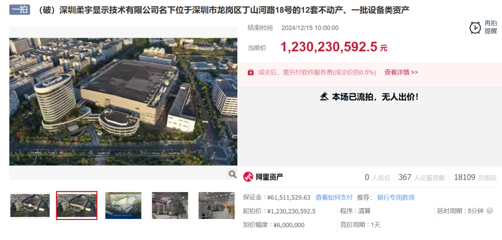 十二月十五日,深圳柔宇显示技术有限公司(以下简称“柔宇显示”)在阿里资产拍卖网上公开拍卖,经过24小时无人出价后,已进入破产程序,在阿里资产拍卖网上公开拍卖。此次拍卖于12月14日10时开始,12月15日10时结束,起拍价约12.3亿元。