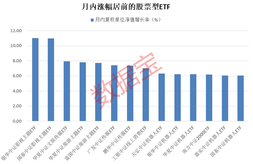 在股票ETF中,29个ETF每月复权单位净值增长5%以上。ETF是影视和旅游相关主题的最佳表现。,ETFF银华中证影视主题、ETFF国泰中证影视主题、ETF华夏中证娱乐传媒、华夏中证旅游主题ETF、ETF是富国中证旅游的前五大主题。