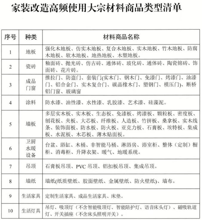 补贴产品类型包括地板、地砖、成品门窗、涂料、墙板、厨卫水暖设备、集成吊顶、壁纸、生活家具(含定制)、10种商品,如生活灯具。