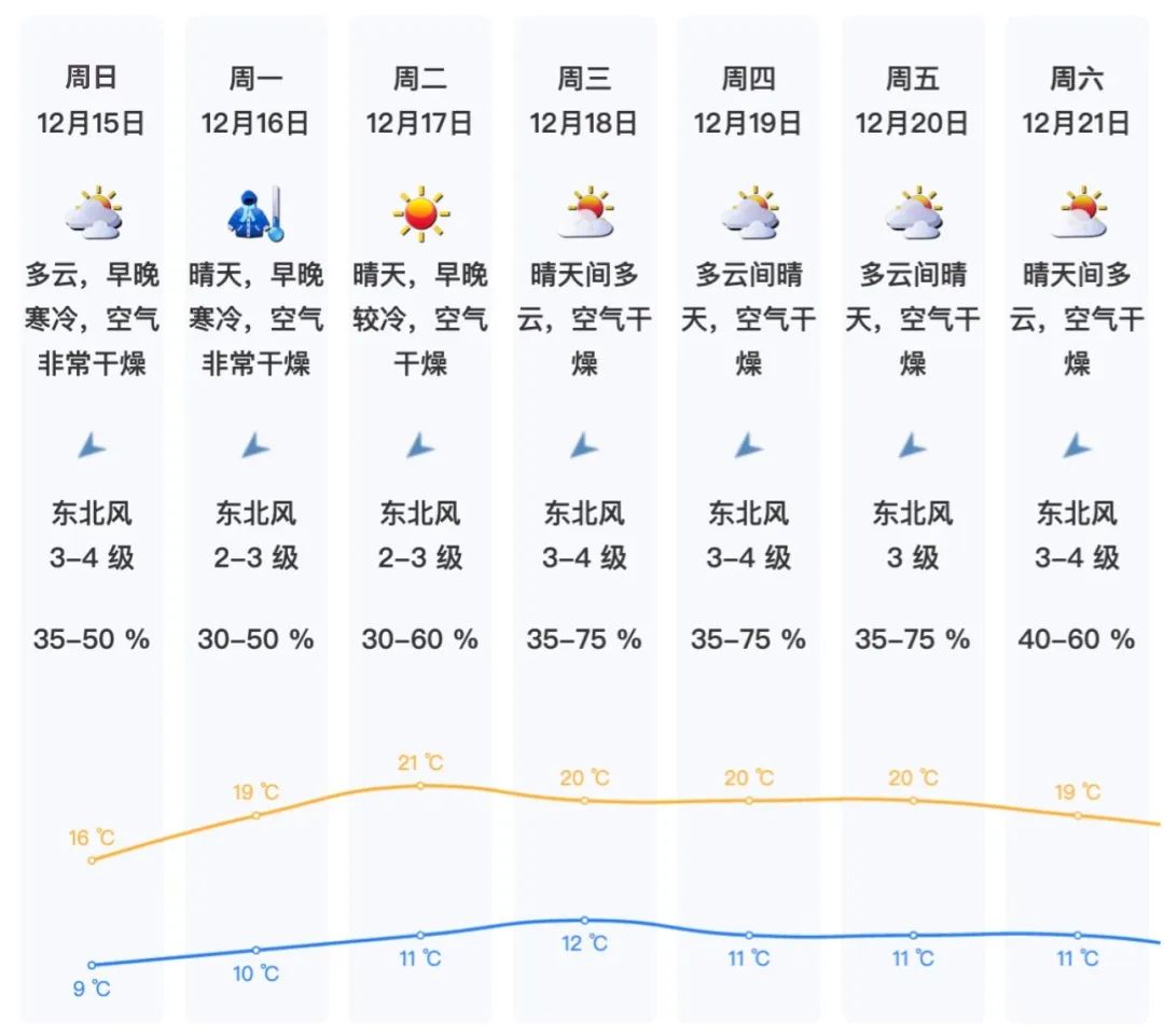 十二月十五日,阴天,早晚严寒,气体十分干燥;气温9-16℃;东北风3-4级,相对湿度35%-50%。