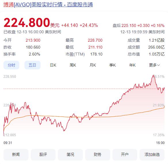 这种表现促使博通股价在? 12 月 13 日暴涨 24.43% 至 224.8 美金 / 股票,市值首次突破 1 价格为亿美元。