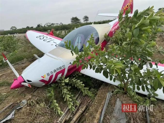 网友发布的照片显示,一架粉色涂装的小型固定翼飞机停在果园内,机头螺旋桨损坏,机翼一侧碰到地面,乘客舱完好无损,内部无人。机翼号码上写着“12S8”字样。
