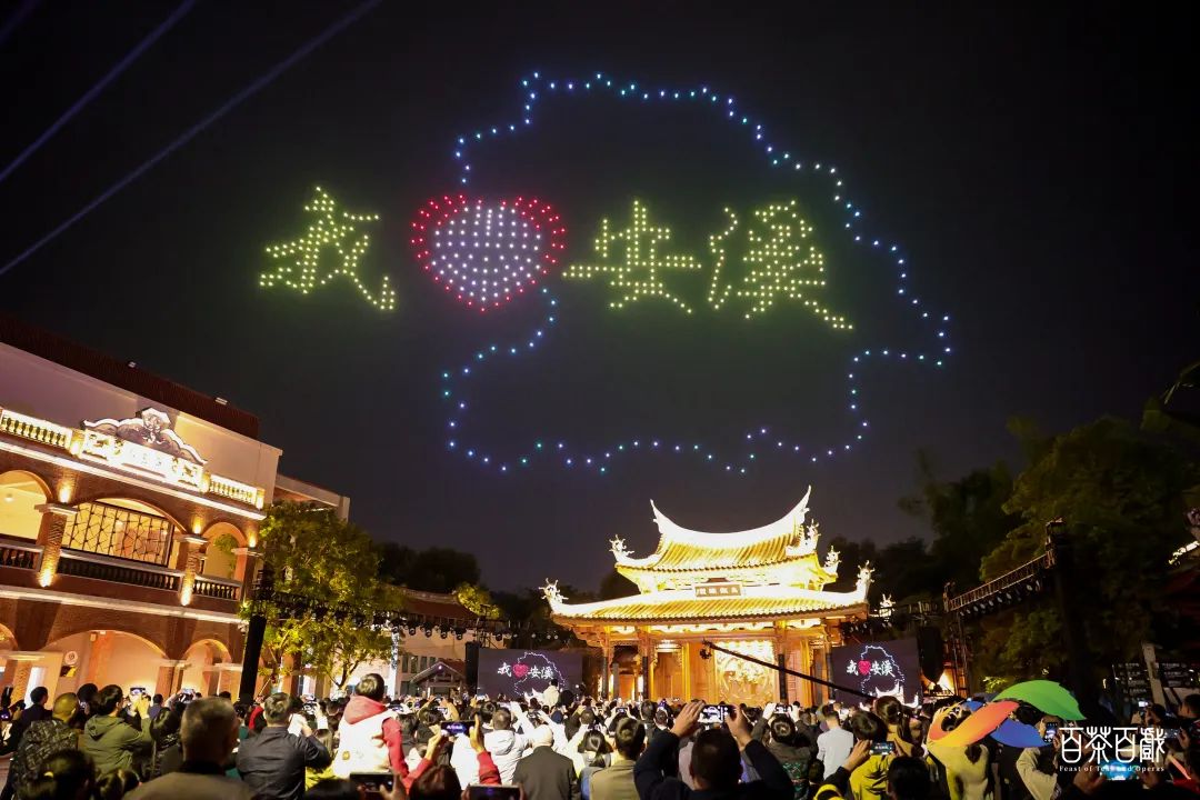 现场灯光变幻莫测,500架无人机从天而降,交错起降,阵容变换,在夜空中飞舞。过了一会儿,形成了“百茶百戏”、“中国百茶贸易之都”、“三铁三世遗”、“安溪铁观音”等字样。过了一会儿,孙悟空、龙在天、安溪地图等图案被改造出来。在场的市民和游客抬头看着,拿出手机记录精彩瞬间。