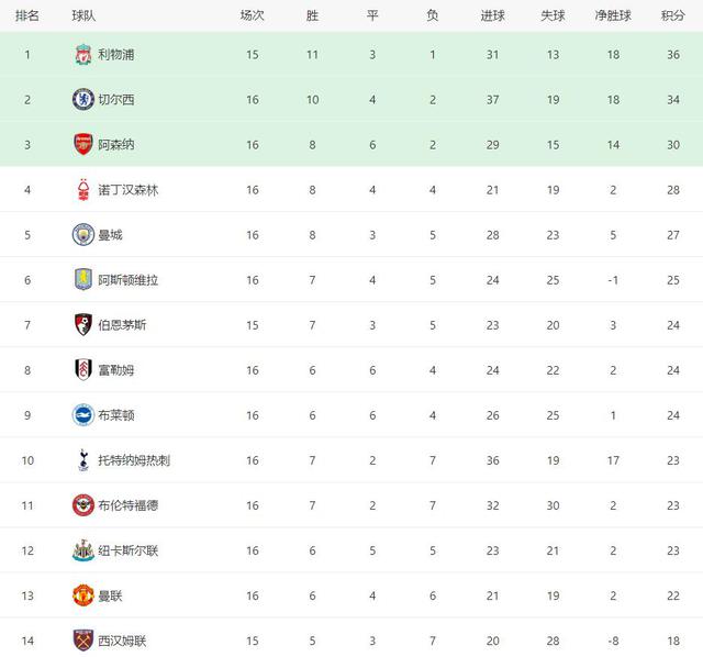 英超第 16 轮子在北京时间 12 月 16 几天后,多场比赛结束,积分榜上的最新排名也发布了。利物浦继续领先,切尔西逐渐赶上红军;曼城已经跌出前四,但曼联曼联德比依然只能排名第一。 13。