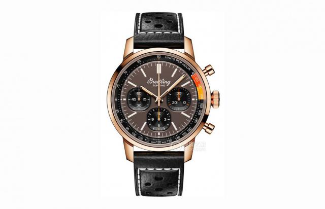 手表评价:百年灵 TOP TIME 该系列可以追溯到上个世纪。 60 时代人们热爱速度和激情,所以跑车和摩托车的火爆程度被百年灵放在表盘上,赛车仪表盘的设计元素融入到手表中,创造出经典而复古的 TOP TIME 系列。OP TIME 系列 RB01761A1Q1X1 表将“圆中带方”的设计理念融入到手表中 41 mm表径的表盘,3 记时30分钟,6分钟, 十二小时累计记时,9小时, 点位的小秒盘采用方形设计,具有弧度但没有棱角。棕色盘面外设有黑色环形测速尺,标有显眼的红色和黄色,再加上黑色穿孔小牛皮表带的设计,充分展现了整体的复古感和赛车仪表盘的形象。18K 红金表壳保证了最豪华的外观,同时也提供了良好的耐磨性和耐腐蚀性。内部搭载百年灵自制。 01 机械机芯型自动上弦,一小时摆动频率为 28,800 第二,有约定 70 动力储备能力小时。