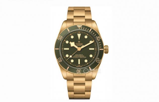 手表评价:谈到金表的最佳表盘颜色,绝对不是黑色或棕色,而是绿色。归根结底,绿色的盘面在光线的照射下能衬托出金色更闪亮、更细腻的质感,更显贵气。帝舵碧湾 1958 型 18K 金表(型号:M79018V-0006) 18K 黄金材料也使这款碧湾成为帝舵整个品牌的天花板级别。18K 经过全磨砂处理,金表壳和实心表链呈现出大规模拉丝的优雅质感。采用白色立体时标和经典雪花指针,表盘上的金绿色盘面覆盖着夜光镀层。18K 金子单向旋转外侧,结合哑光绿色阳极氧化铝 60 分钟刻度字圈,以及镀金数字和刻度,整体和谐也更加奢华。透明底盖的设计并不常见,但是仍然有 200 大米防水能力。内部配备了帝舵原厂。 MT5400 型型机芯,配有硅游丝,振频 具有瑞士官方天文台认证的28800VPH,每日偏差在 -2 至 4 秒之间,以及 70 动储能力小时。
