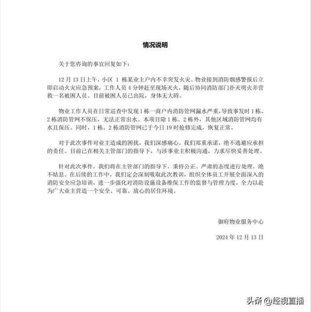 12 月 13 日本,经视直播记者联系上海永升物业管理有限公司武汉分公司。工作人员提供了一份情况说明,指出小区物业工作人员在日常检查中发现, 1 栋一商家内消防管网渗水严重,造成事故发生时, 1 栋、2 建筑物消防管网不能保压,不能正常出水,其它地区的消防管网都有水和保压。同时,1 栋、2 今天已经建立了消防管网 19 及时修理,恢复正常。现在,被困人员已经出院,身体健康没有严重问题。