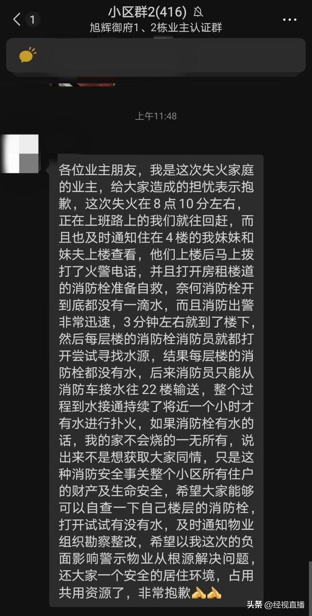 余先生提供了小区业主的聊天截图。截图显示,家里发生火灾的业主表示,当他得知家里发生火灾时,他通知妹妹上楼检查,打开走廊的消防栓准备自救。然而,消防栓没有水。消防队员迅速赶到现场后,试图打开其他楼层的消防栓,发现没有水。