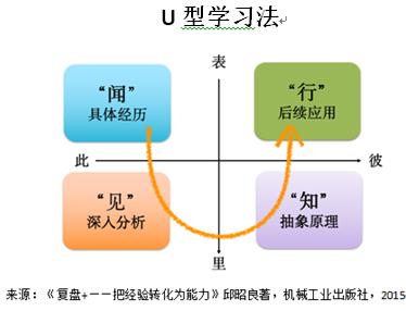 在我看来,为了让学习真正发生,复习要遵循具体的流程、步骤或逻辑,每一步都要做到位,学习才能发生。现在《复盘 :把经验转化为能力”这本书,本人以荀子为基础 2000 多年前提出的通过实践成长为君子的理论模式,提出了复盘的底层逻辑-" U 型学习法"(如图 1 所示)。