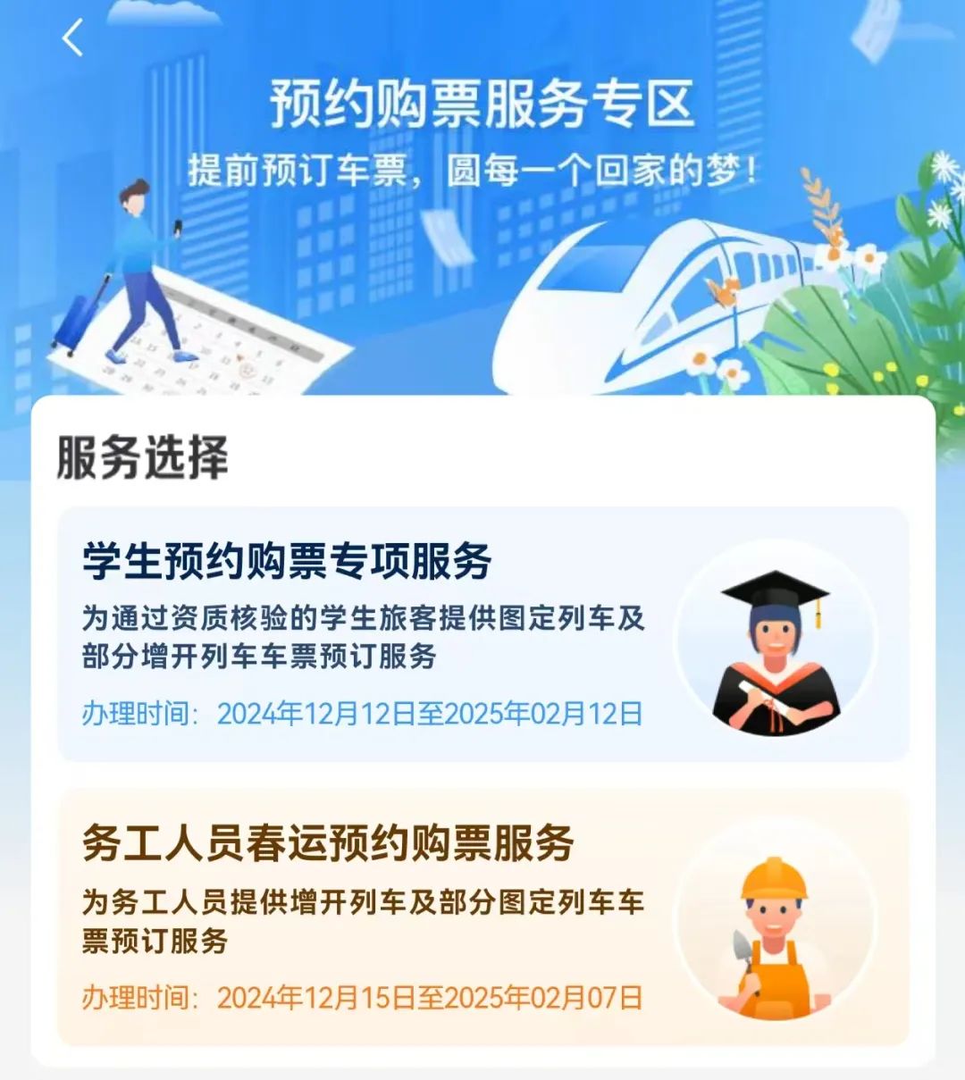 十二月十五日,铁路12306手机客户端工作人员预约购票服务上线,符合条件的旅客可以在2025年春运高峰期间通过专区预约来回购票。