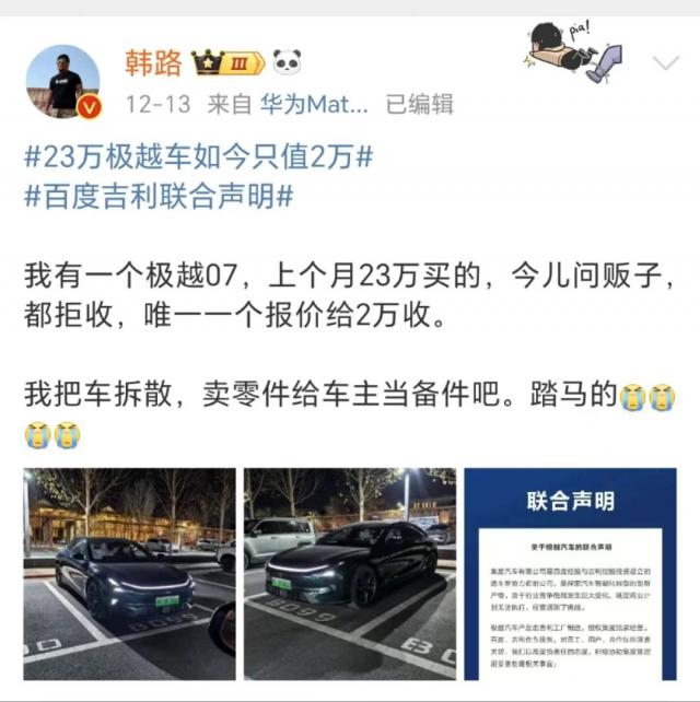 汽车博主韩路的询价经历让许多车主心中拔凉拔凉。上个月以来,他发表了一篇文章。 23 一万元买了一辆极越 07,然而在 13 当被问及二手车商贩时,他们被拒绝了。唯一愿意购买的价格是 2 万元。