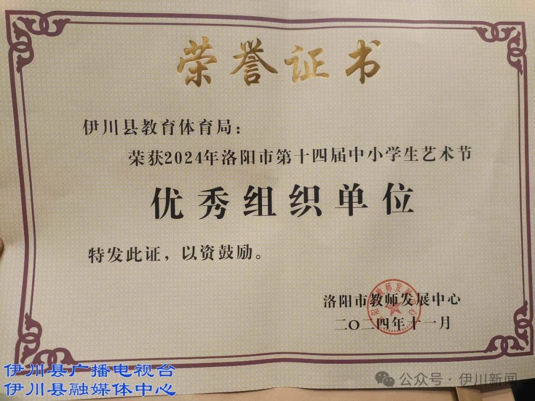 据了解,洛阳市教师发展中心根据上级相关文件精神,组织了洛阳市中小学生班级合唱比赛,旨在全面贯彻党的教育方针,提高学生审美和人文素养,促进学生健康成长,促进学校艺术教育改革发展。比赛期间,我县代表队大放异彩,取得了不错的成绩。其中,伊川县直属中学获得中学组一等奖,伊川县西场学校和伊川县新区实验小学分别获得小学组一等奖;2024年洛阳市第十四届中小学生艺术节伊川县教育体育局荣获“优秀组织单位”荣誉称号。(记者 邵晓静)