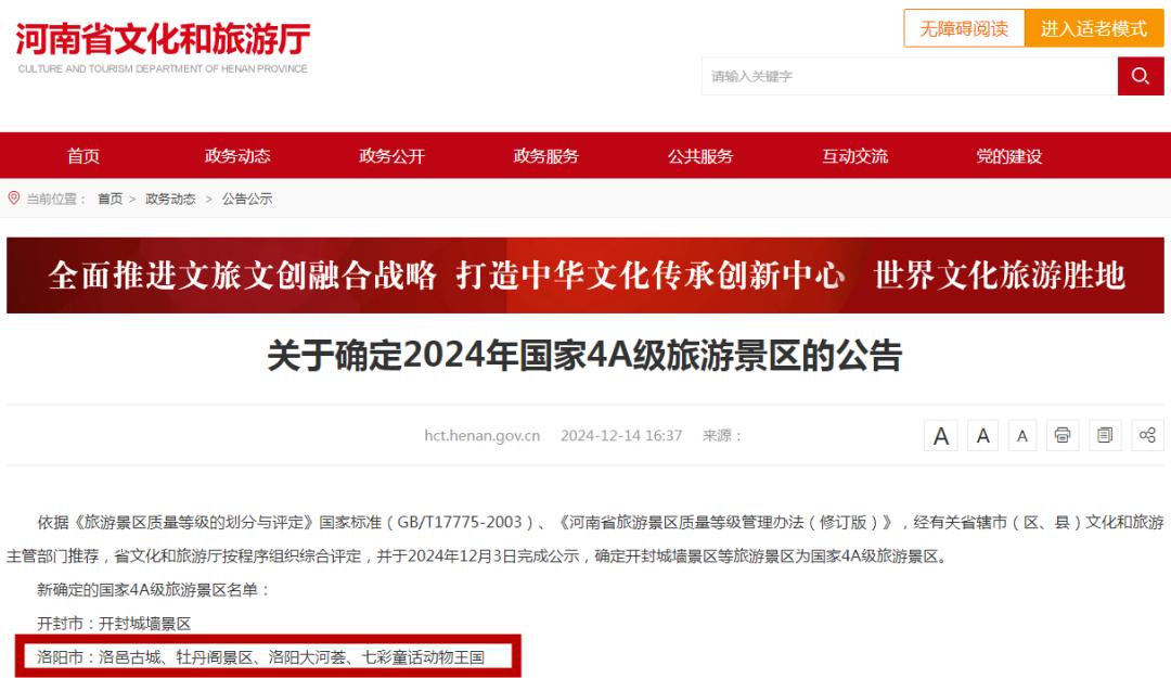 河南省文化和旅游厅近日发布关于确定2024年中国4A级旅游景点的通知。洛邑古城、牡丹阁、江河汇聚、七彩童话动物王国四大景点被确定为中国4A级旅游景点。