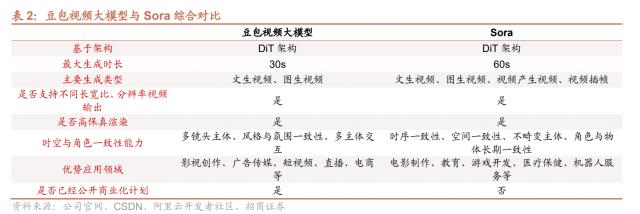 与字节豆包视频相比,大模型 Sora,就综合性能而言,豆包大模型有效突破多镜头切换的一致性问题,保持镜头切换时主体、风格和氛围的一致性,保证多主体的互动能力,是豆包视频模型的专有技术创新。但是就视频最大生成时间而言,豆包视频模型仍然比较 Sora 存在一些差距。应用领域,Sora 应用领域比较广泛,由于企业属性因素,字节豆包视频模型在影视创作、广告媒体、短视频等领域具有很大的应用优势。。在商业化和本土化方面,目前已公布了字节豆包视频大模型的使用方案,同时基于自身优秀的中文语义理解能力,豆包视频大模型在本土市场的应用将会比较好。 Sora 更为广泛。