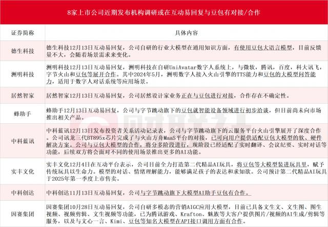 根据财联社不完全统计,截至发稿,包括德生科技、洲明科技、智家、蜂助手、中科蓝讯、实丰文化、中科创达、因赛集团在内的 8 近日,一家上市公司发布机构调研或互动平台回复与豆包合作的有关情况,详见下图: